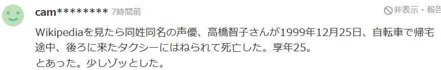 約25年前に高橋智子さんと同姓同名の声優が同じように自転車に乗っている際、交通事故に遭い亡くなっているとされる情報が拡散
